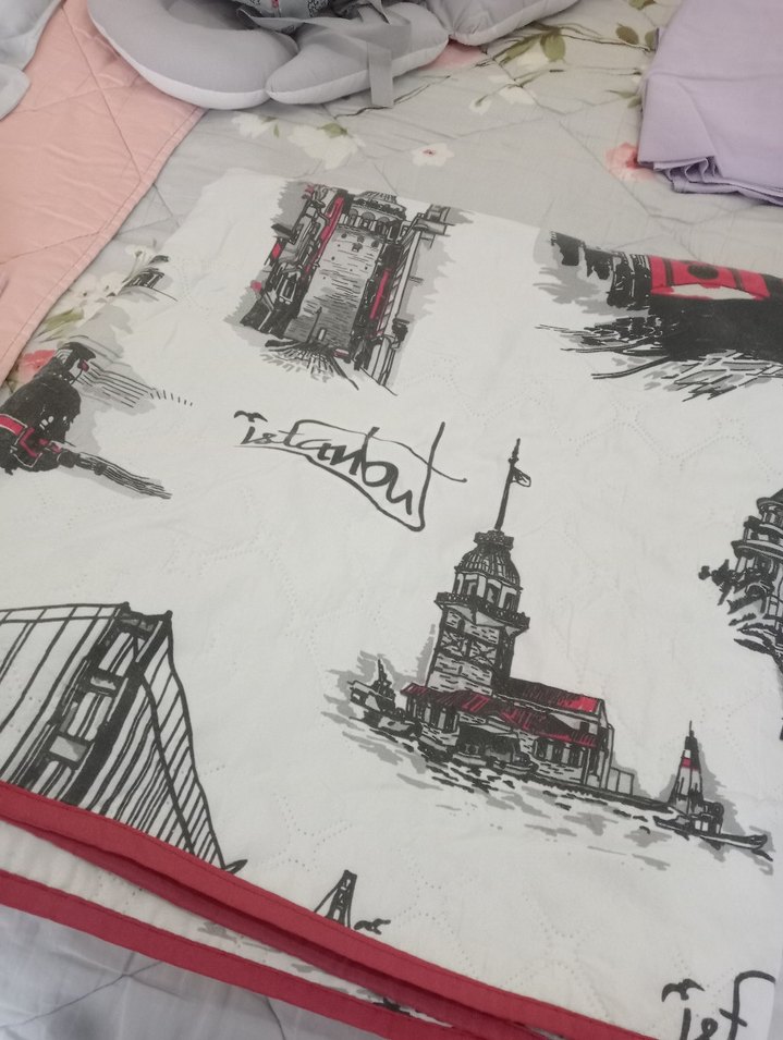 Gri ve beyaz tonlarda baskılı desenli, kırmızı detaylı, yumuşak dokulu ve kapitone desenli yatak örtüsü. ️