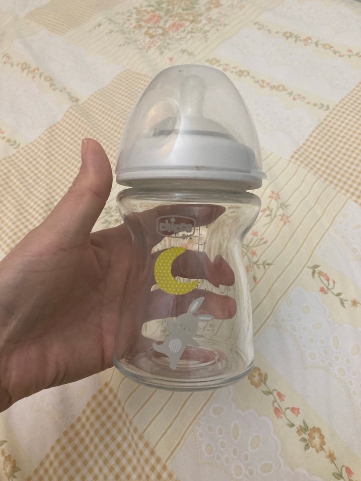 Beyaz ve gri renklere sahip şeffaf biberon, yumuşak emzik ve sevimli hayvan desenleri içerir. Koruyucu kapaklıdır.