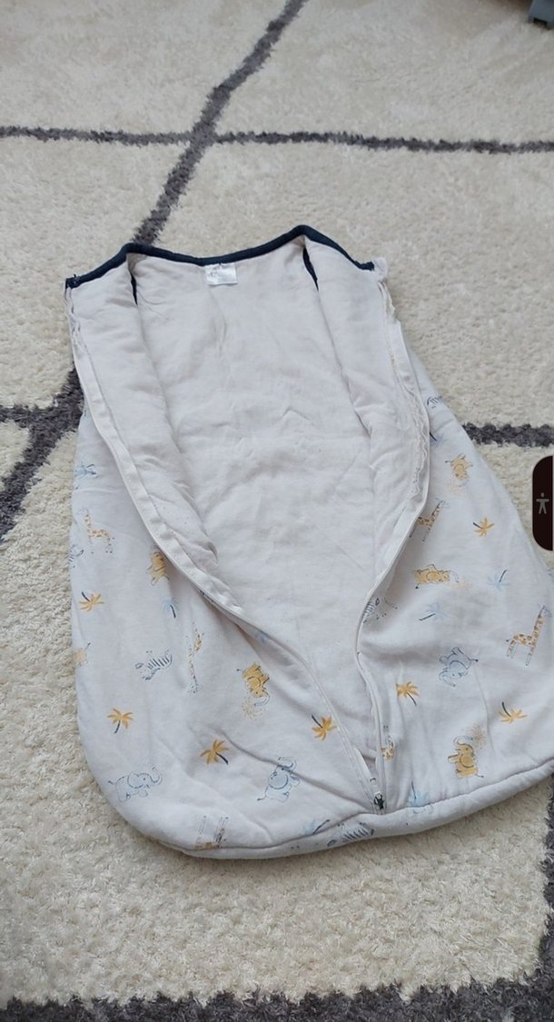Küçük hayvan desenleriyle beyaz ve gri bebek uyku tulumu. Kolay kullanım için fermuarlı ve yumuşak, sıcak kumaşlıdır.