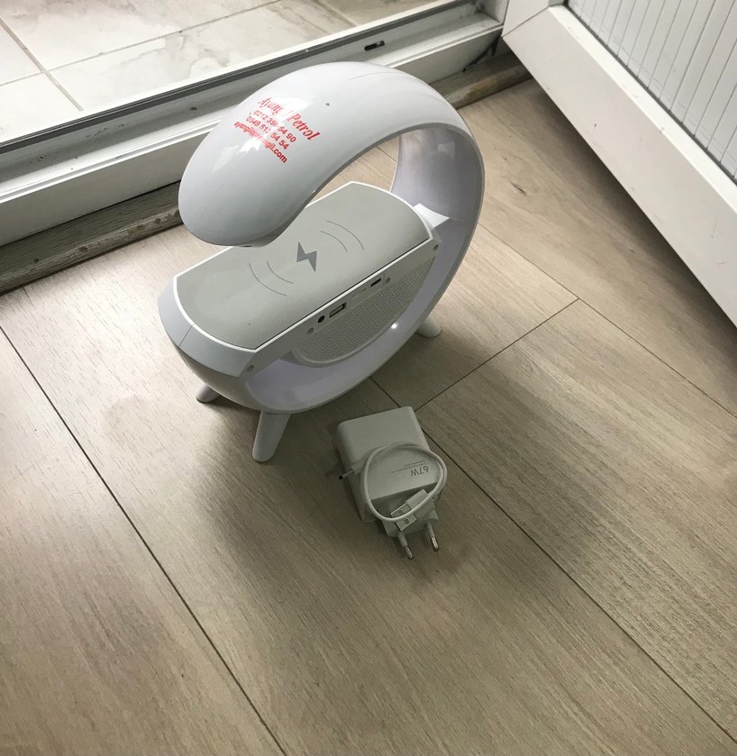 Beyaz ve gri renklerde, özel kavisli tasarıma sahip Bluetooth hoparlör. Şarj adaptörü ile birlikte gelir, kablosuz bağlantı sağlar.
