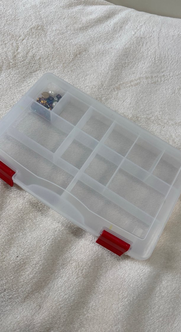 Çok bölmeli beyaz gri organizer kutusu, kırmızı kilitlerle güvenli kullanım sağlar.