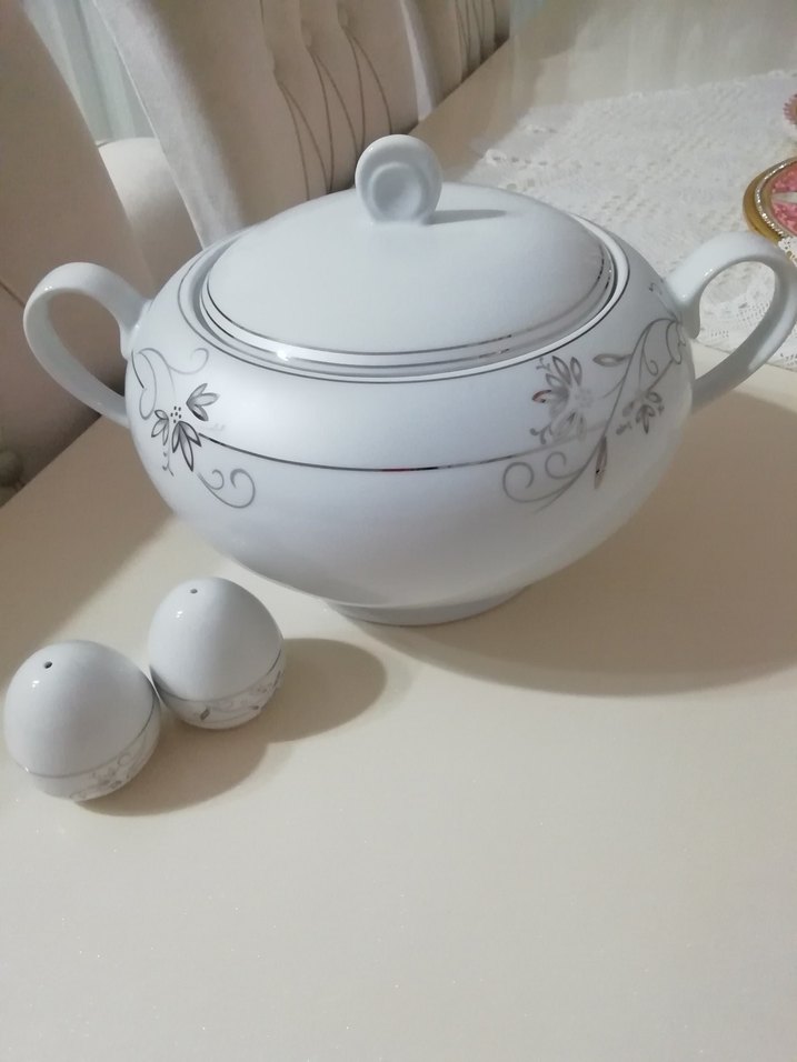Beyaz Gri Çiçek Desenli Kapaklı Çorba Kasesi