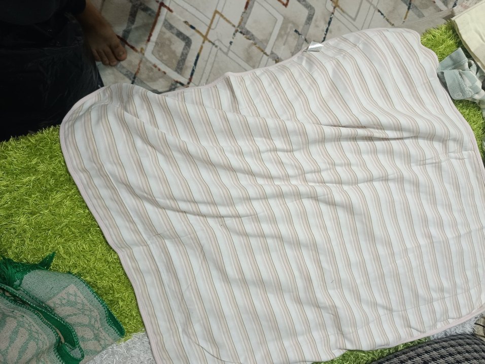 Yumuşak sentetik kumaştan, beyaz ve gri çizgili çocuk battaniyesi, hafif ısı ve konfor sağlar. ️