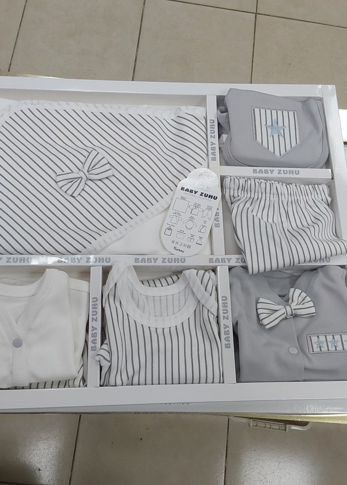 Beyaz ve gri Çizgili %100 pamuklu ve organik hastane cikis setimiz 1 adet battaniye 1 adet Üst zibin 1 adet patikli Pantolon 1 adet iç zibin 1 adet çıtçıtlı bady 1 adet yelek 1 adet önlük 1 adet mendil 1 adet eldiven 1 adet şapka
