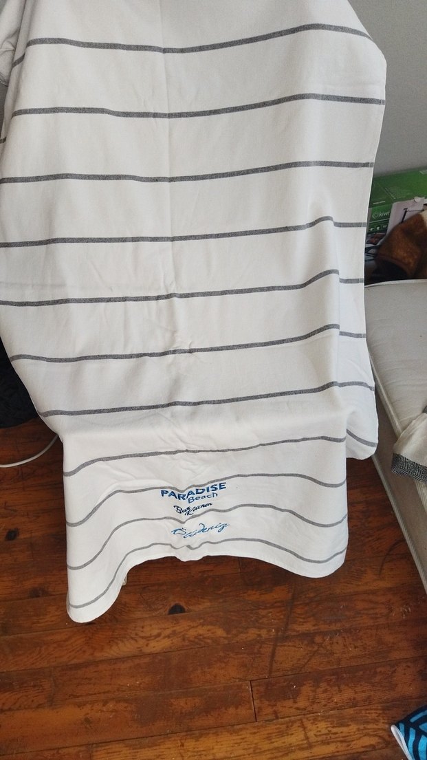Beyaz zemin üzerine gri çizgilerle baskılı, uzun ve drapeli erkek plaj havlusu. Günlük kullanım için uygun, sade sokak stili ve alt kısmında baskılı logo detayı bulunur. ️