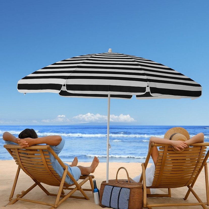 Beyaz ve siyah çizgili, minimalist tasarıma sahip plaj bahçe şemsiyesi. Bohem ve retro tarzlara uygun, klasik çizgili deseniyle gölge sağlar. 114-240cm ayarlanabilir esnek kırılmaz yapısı ve kaliteli brandasıyla uzun yıllar kullanacaksınız Farklı renk seçenekleri mevcut…