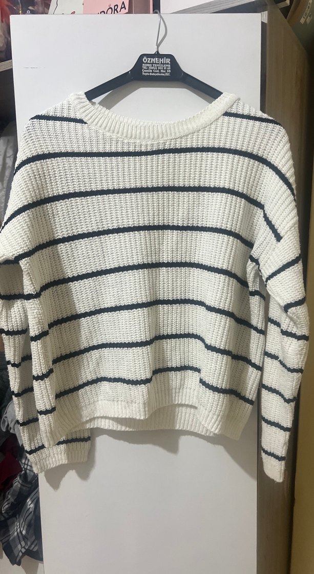 Yuvarlak yaka ve uzun kollu, örme kumaştan yapılmış bu kazak, beyaz zemin üzerinde gri çizgilere sahip. Rahat kesimiyle günlük kullanıma uygun.