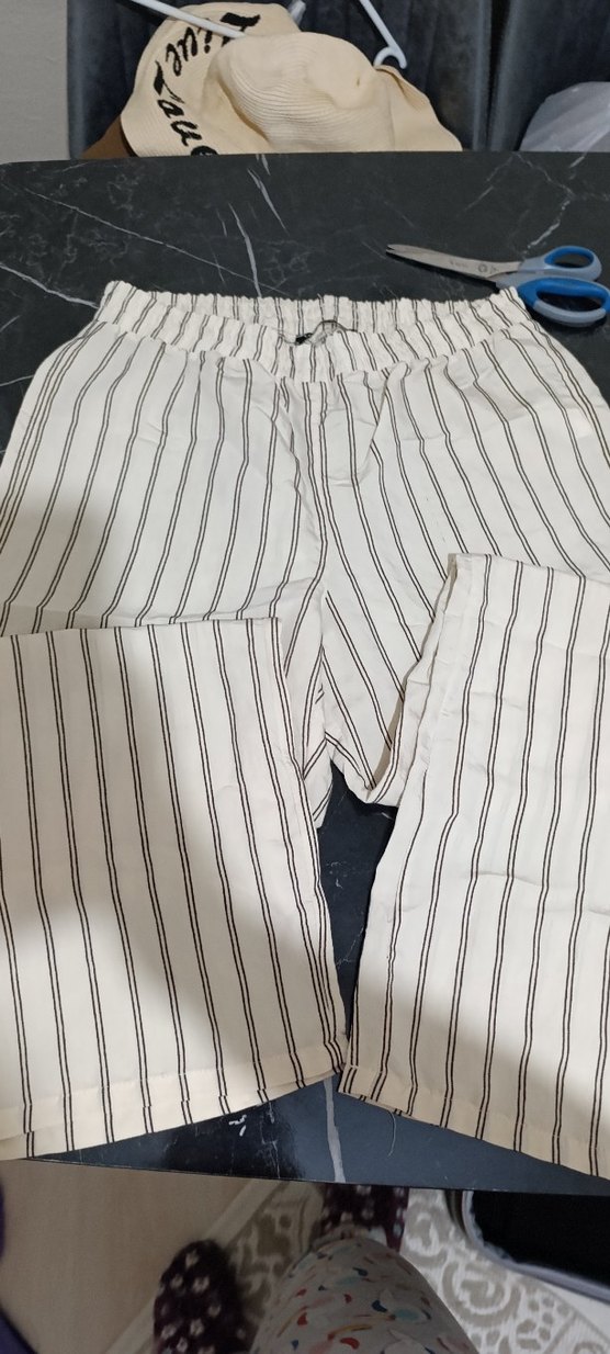 Beyaz zemin üzerine gri çizgili, keten kumaştan, pileli ve bol kesim midi uzunluğunda kadın pantolon. Günlük rahat stil için uygundur. ustunde bir cizik mevcut aldigimdada bu sekildeydi