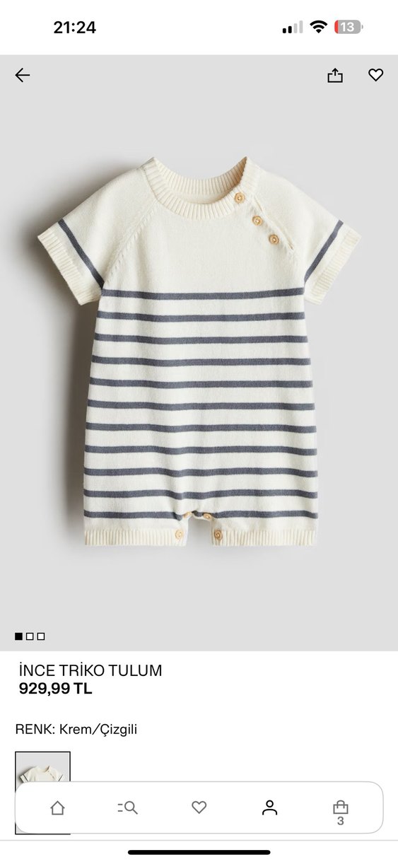 Kısa kollu, yuvarlak yaka, pamuklu ince triko kumaştan yapılmış bebek tulumu. Beyaz zemin üzerine gri çizgiler ve omuz ile alt kısmında düğme detayları bulunur.