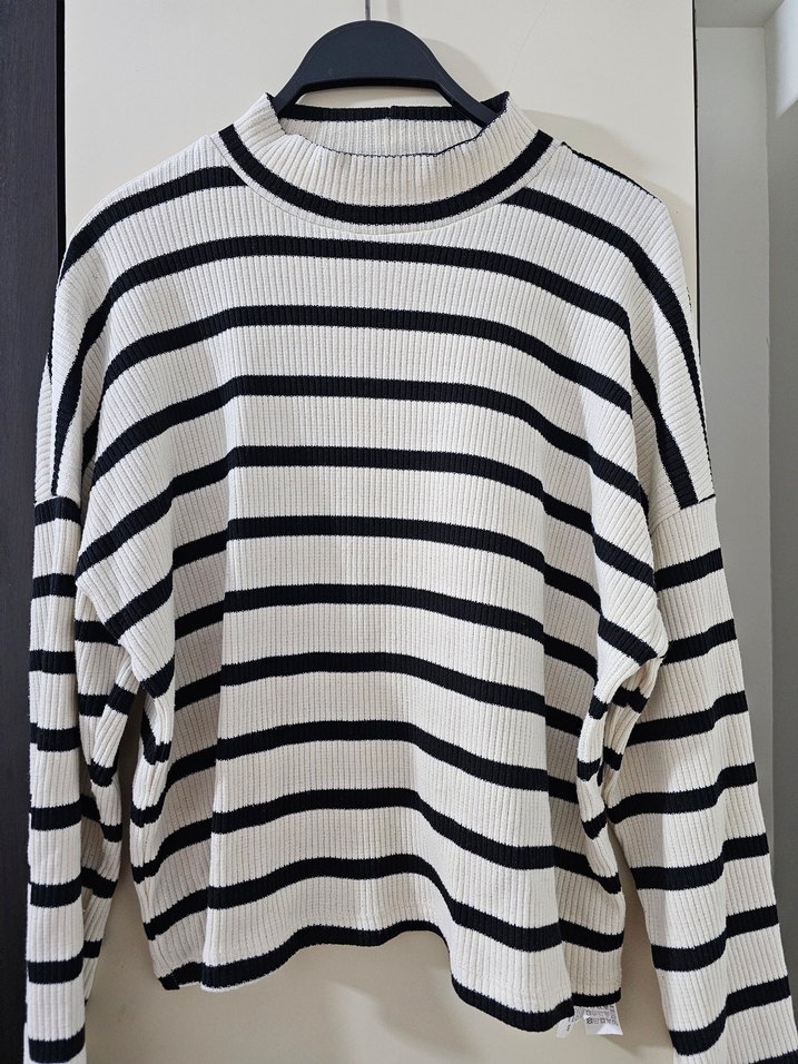 Uzun kollu, bisiklet yaka, bol kesim kadın kazak. Beyaz ve gri çizgili örgü dokusu, sentetik kumaş ile günlük kullanıma uygun.