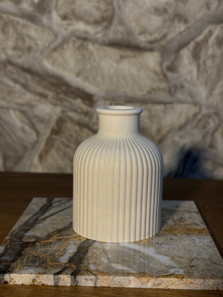 Dikey çizgili beyaz ve gri renkte seramik vazo. İnce boyunlu ve yuvarlak gövdeli, çiçek sergilemek için uygun.