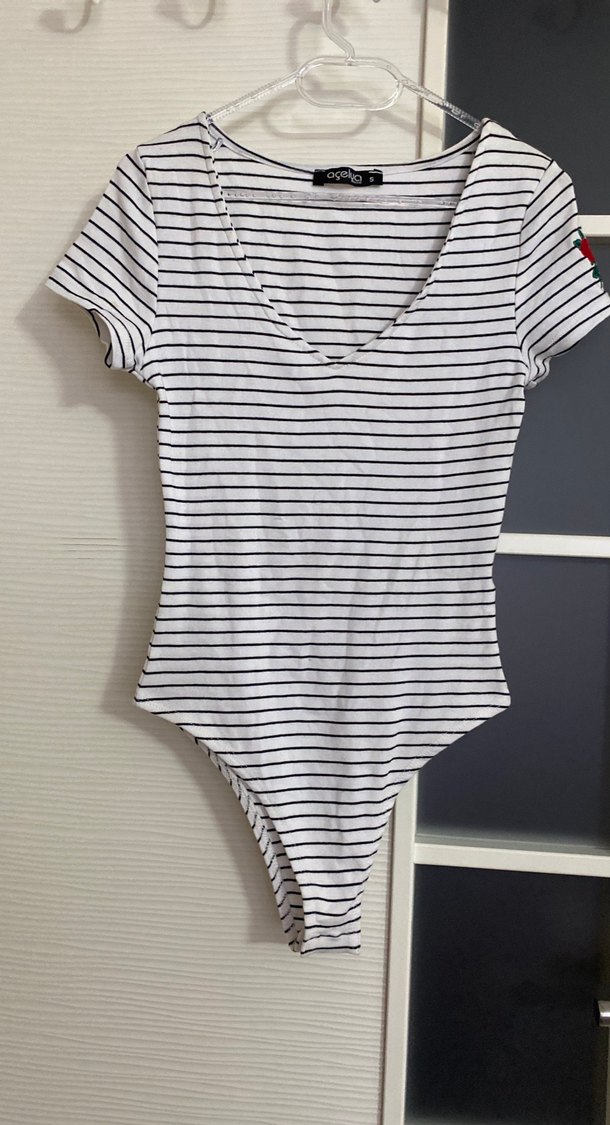 V yaka ve kısa kollu, beyaz zemin üzerine gri çizgili kadın body. Rahat ve şık tasarımıyla günlük kullanım için uygundur.