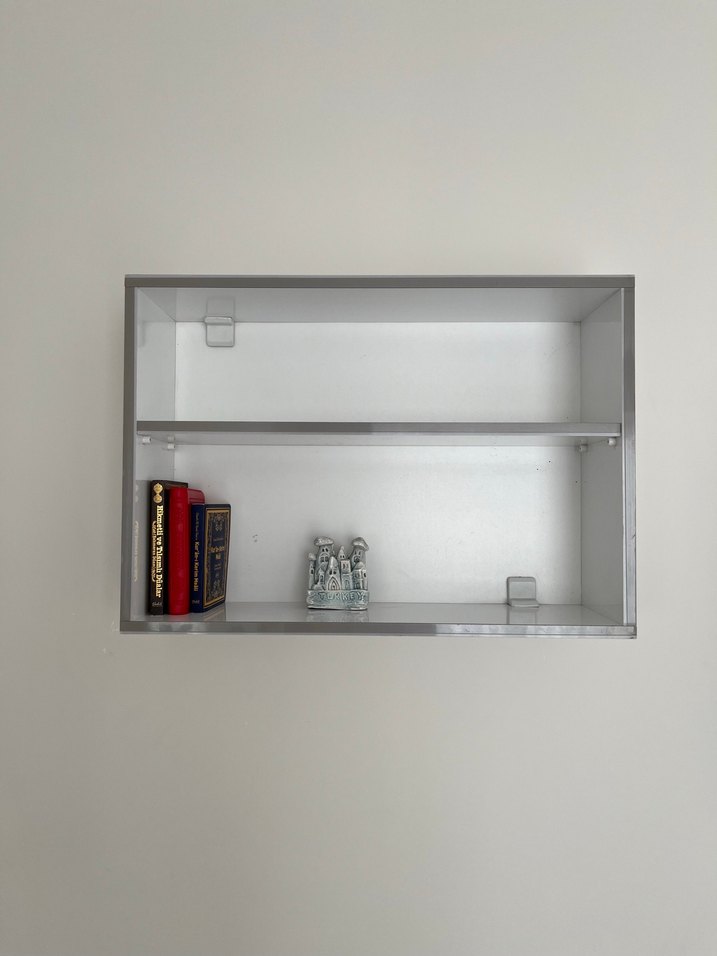 Beyaz ve gri renkte, kitap ve küçük oyuncaklar için iki bölmeli çocuk rafı. Basit ve modern tasarım.