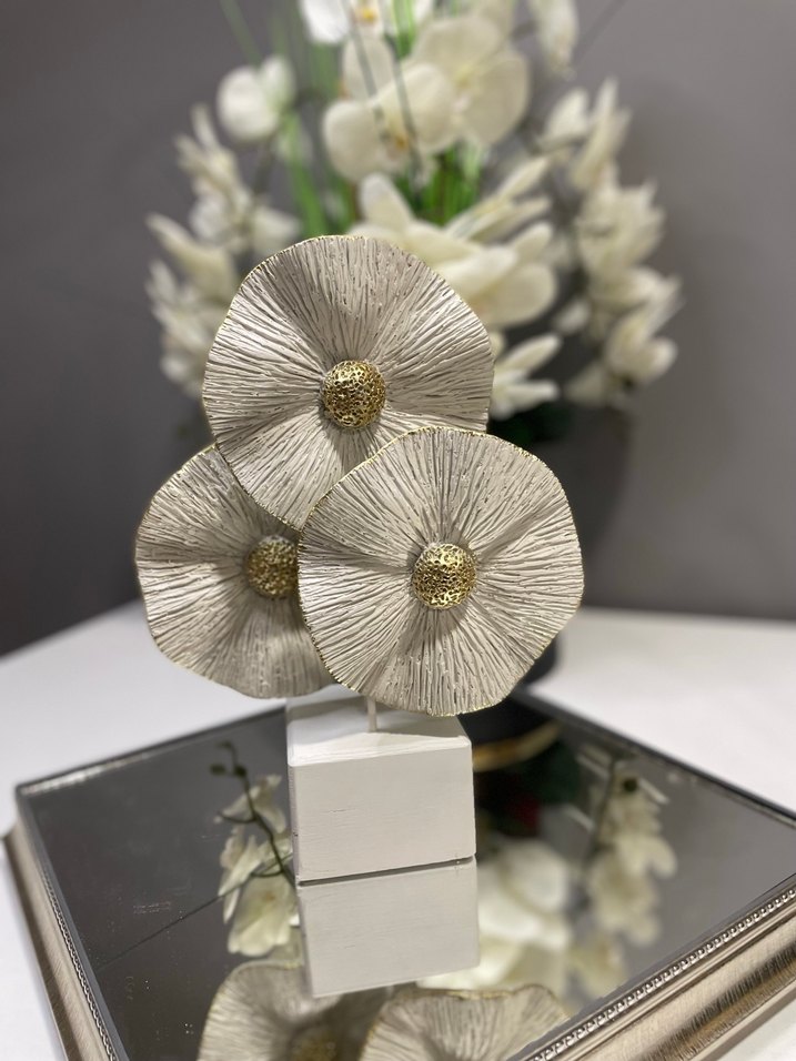 Beyaz ve gri tonlarda, dokulu üç çiçekten oluşan dekoratif heykel. Ev dekoruna zarif bir dokunuş katar.