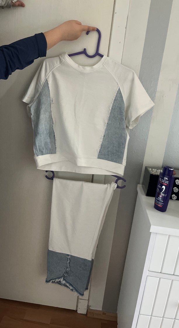 Kadınlar için beyaz ve gri denimden mini uzunlukta, kısa kollu, yuvarlak yakalı bol kesim eşofman takımı. Sokak stilini yansıtan rahat ve şık tasarım.