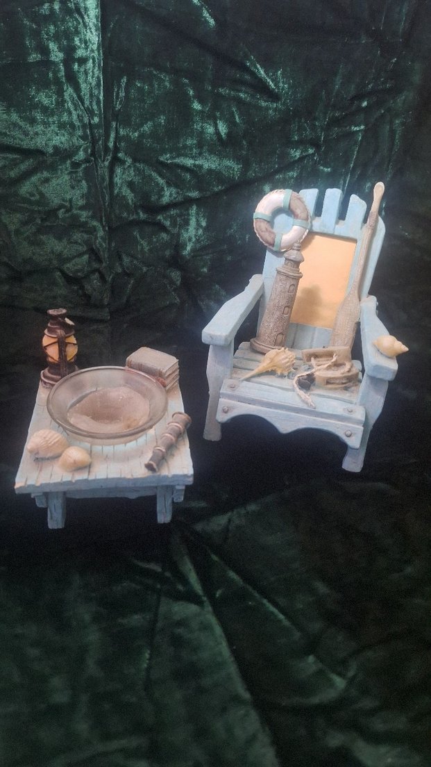 Beyaz ve gri renklerde, deniz temalı sandalye ve masa seti, deniz kabukları, fener ve can simidi gibi dekoratif öğeler içerir.