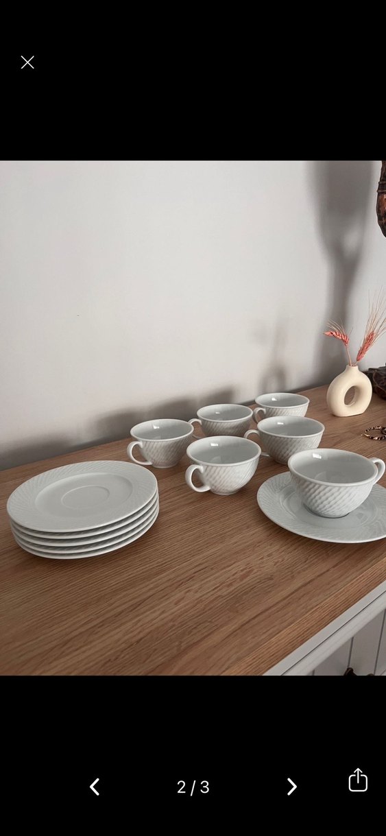 Gri desenli beyaz 6 fincan ve tabak seti, sıcak içecekler için uygun. ☕