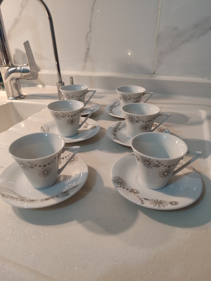 Gri çiçek desenli beyaz kahve fincanları ve altlıklarından oluşan 6'lı set. Espresso veya Türk kahvesi sunumu için uygundur. ☕fazlalıktan dolayı satılık teklif verebilirsiniz birinde hafif kırık gibi bişey var