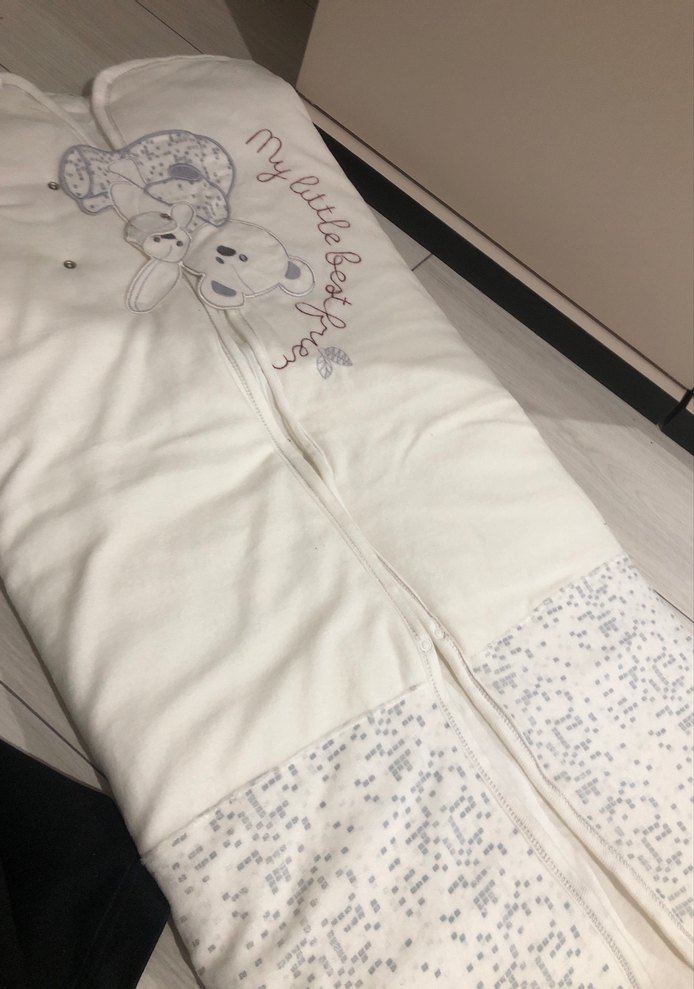Yumuşak kumaştan beyaz ve gri renkte, baskılı desenli ve kolay kullanım için ön fermuarlı bebek uyku tulumu.