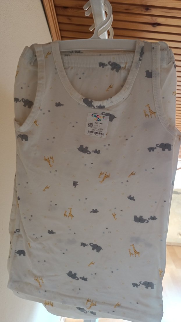 Yumuşak kumaştan yapılmış, gri ve sarı hayvan desenli beyaz çocuk atleti.