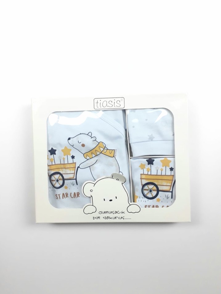 Yumuşak ve sıcak kumaştan, yıldız ve ayı desenli beyaz gri çocuk battaniyesi.