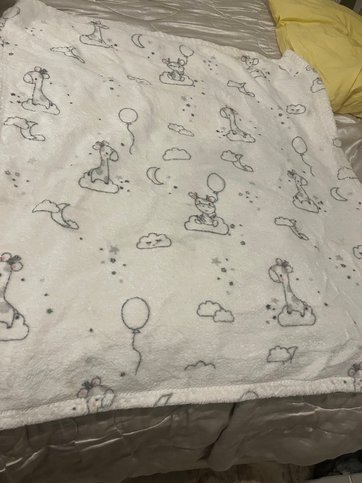 Yumuşak ve sıcak çocuk battaniyesi, beyaz zemin üzerinde gri desenli zürafalar ve balonlar bulunur. Rahatlık için ideal.Boy-100 en 85