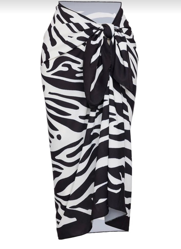 Yumuşak sentetik kumaştan, siyah beyaz soyut desenli, drapeli tasarıma sahip kadın pareo. Modern ve athleisure tarzını bir araya getiriyor.