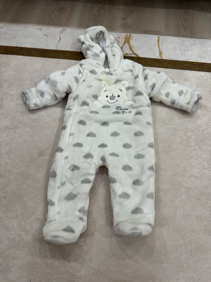 Yumuşak ve sıcak kumaştan, kapüşonlu, gri-beyaz bulut desenli, kürk detaylı erkek bebek tulumu. Sokak stiliyle tasarlanmıştır. Boy 56 cm (3.ç) #bebek #giyim #kıyafet #elbise