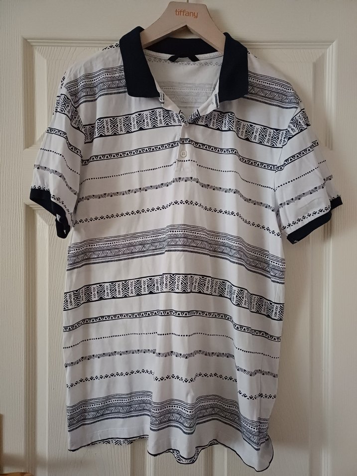 Kısa kollu, düğmeli yakalı erkek polo tişört. Beyaz zemin üzerine gri desenli, rahat kesim, günlük sokak stili için uygun.