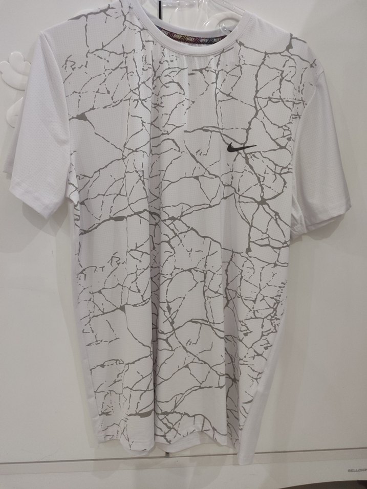 Beyaz, gri baskılı desenli, bol kesim erkek tişört. Sentetik kumaştan, yuvarlak yakalı, günlük dış mekan kullanıma uygun.
