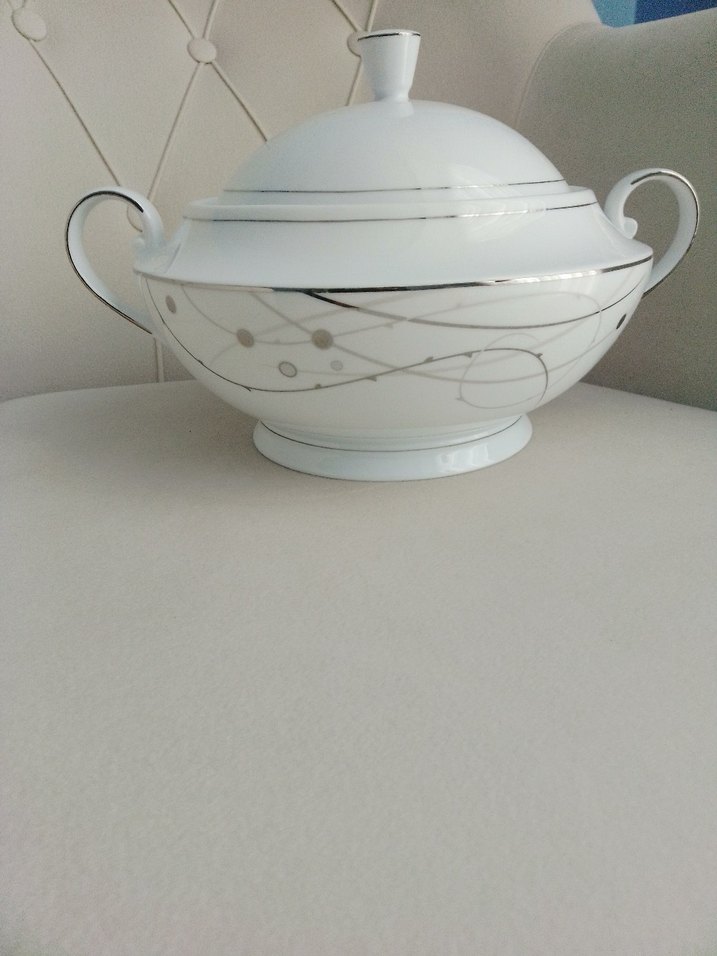İnce gri çizgi ve noktalarla süslenmiş, kapaklı beyaz porselen çorba kasesi. İki kulplu ve klasik tasarımlı.