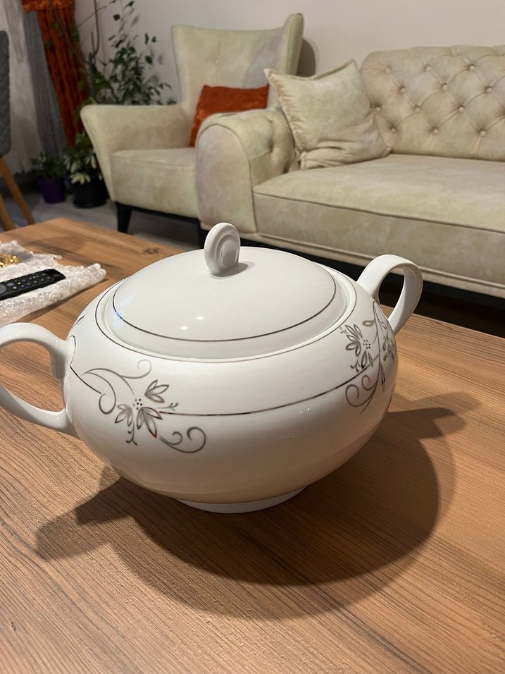 Beyaz Gri Desenli Porselen Çorba Tenceresi