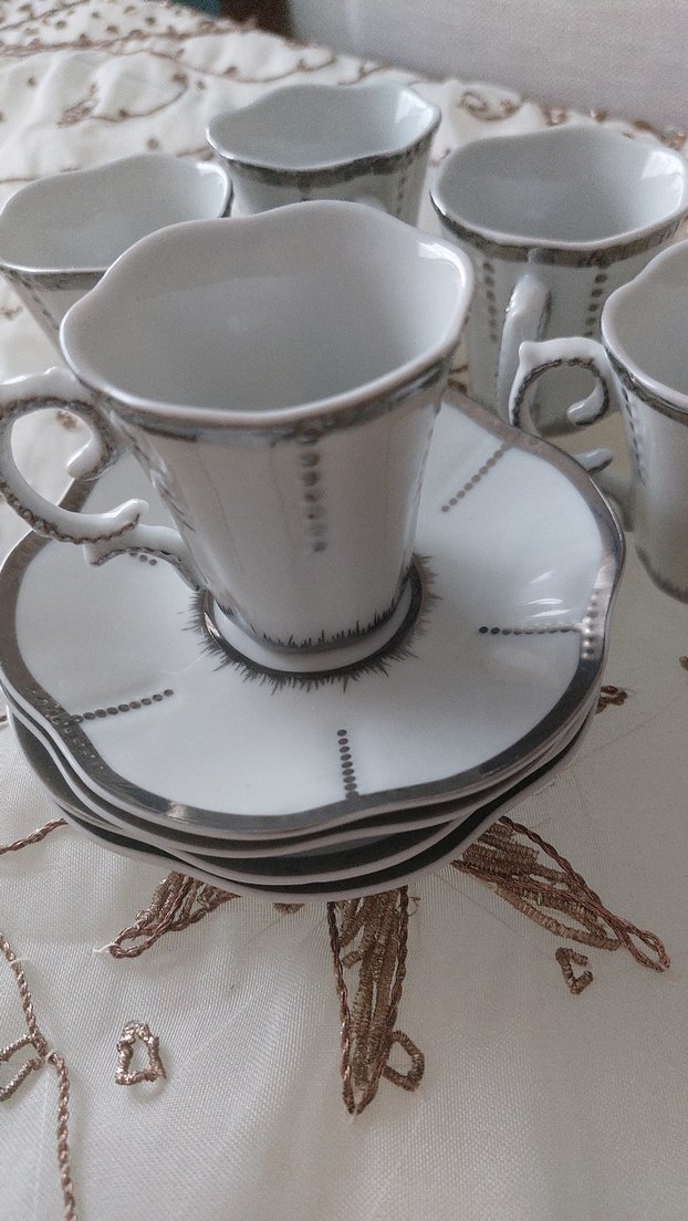 Gri desenli beyaz porselen fincan seti, şık kulplar ve klasik tasarıma sahip tabaklarla birlikte. 5 fincan 4 alt vardır hiç kullanılmadı. taşınma esnasında kırılmış diğer parçalar. kutulu gönderilecektir.