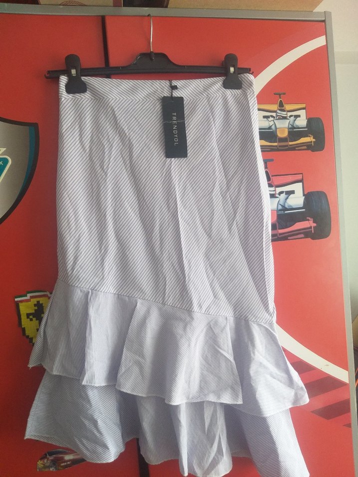 Beyaz ve gri desenli, volan detaylı etek Sentetik kumaştan üretilmiş, günlük sokak stili için uygun, rahat kesim.