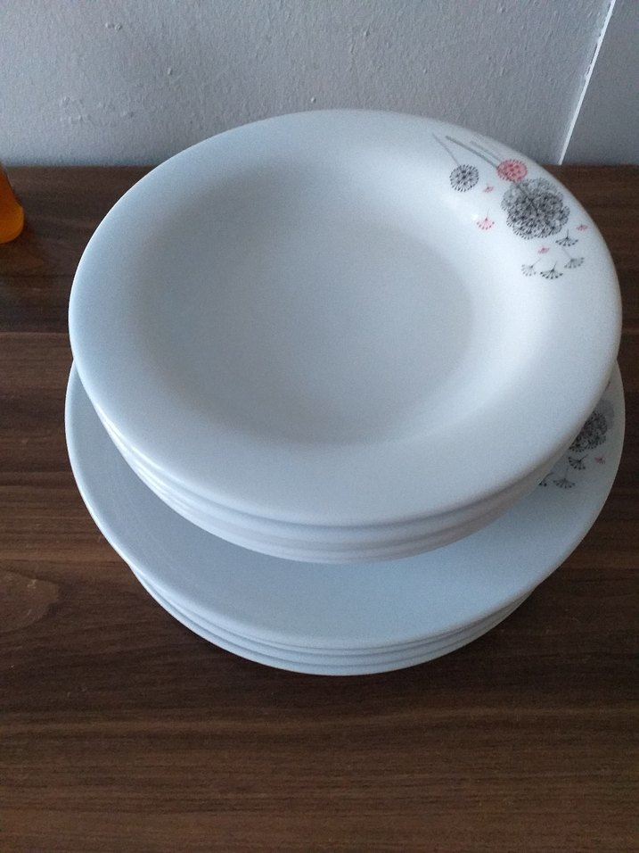 Beyaz tabanlı, gri-pembe çiçek desenli yemek tabakları seti. Yemek sunumuna zarif bir dokunuş katar. ️6 adet servis 6 adet yemek tabagi buyuk boy
