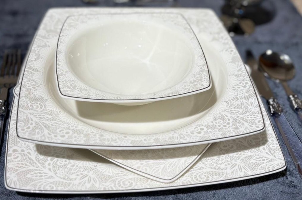 Beyaz ve gri renklerde, ince çiçek desenleriyle süslenmiş yemek takımı, şık sunum imkanı sağlar. Tabak ve kaselerden oluşur. ️ 6 kişilik 24 parca