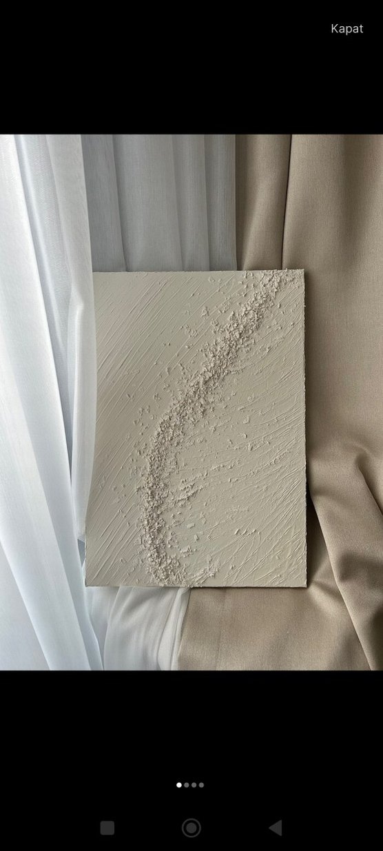 Bu soyut tablo, beyaz ve gri tonlarda dokulu yüzeye sahip, kanvas üzerinde kavisli bir desen oluşturuyor. 30*50 fiyatı