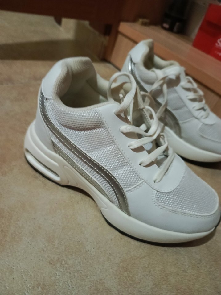 Beyaz ve gri dolgu topuklu, bağcıklı ve kauçuk tabanlı spor ayakkabı. Rahat ve trend sokak stili için uygun.