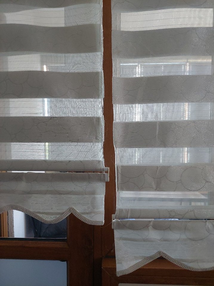 Geleneksel tarzda, düz desensiz beyaz ve gri tonlarda, dalgalı kenarlara sahip perdeler. kirli yıkanması lazım