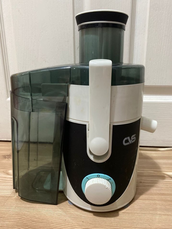 Beyaz ve gri renkli, kontrol düğmeli ve şeffaf meyve kabı bulunan elektrikli meyve sıkacağı. Taze meyve suyu çıkarmak için uygundur.