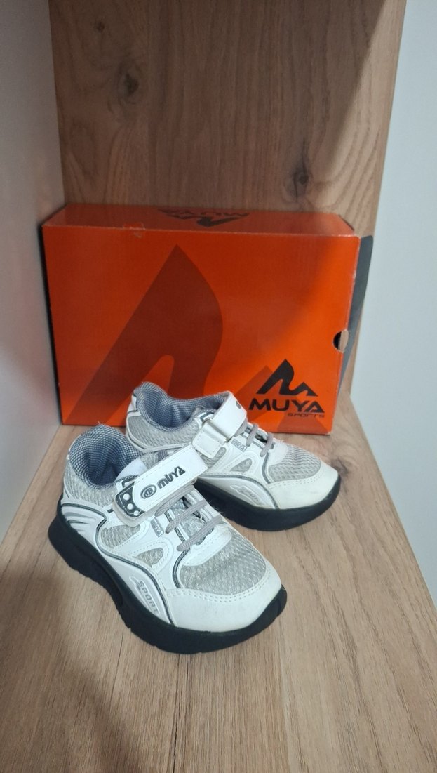 Beyaz ve gri renklerde baskılı, cırt cırtlı erkek çocuk spor ayakkabısı. Kauçuk tabanlı, sokak stiline uygun tasarım. MUYA markalı.