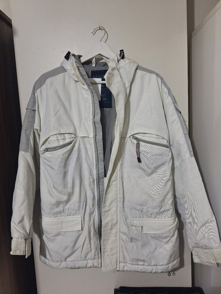 Beyaz ve gri renklerde, fermuarlı cepleri ve kesimli yakasıyla erkek kayak ceketi. Rahat kesim, uzun kollu ve midi boy, sentetik kumaştan üretilmiştir. ❄️