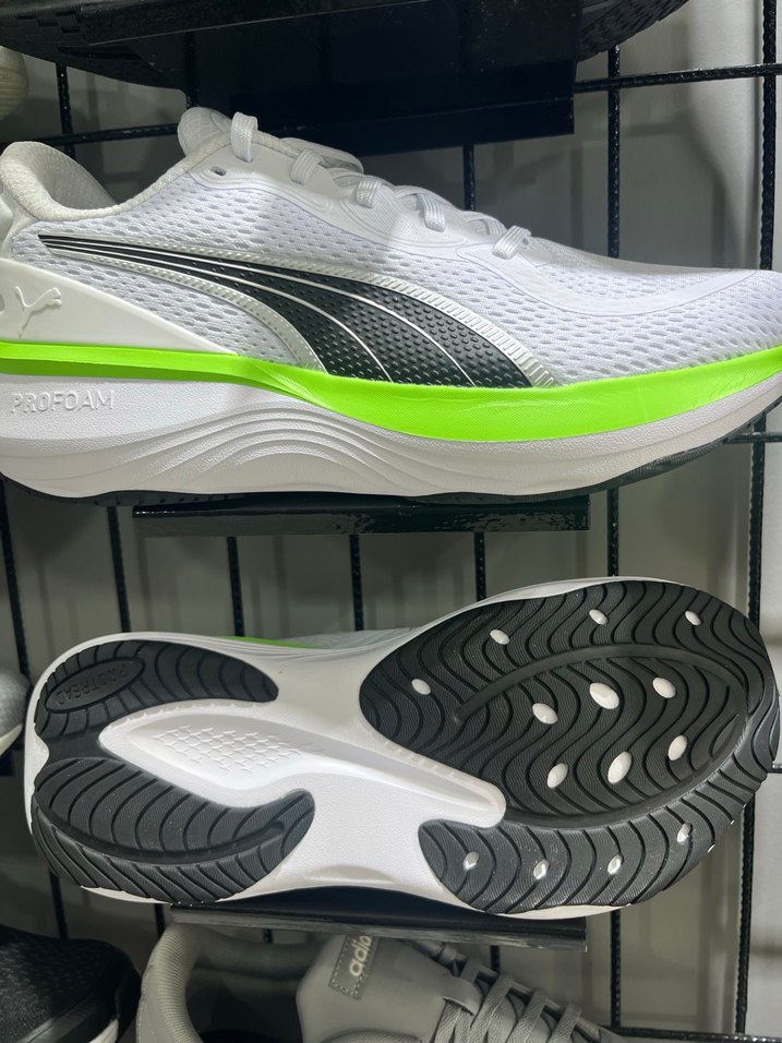 Beyaz , baskılı detaylı ve Velcro kapamalı erkek koşu ayakkabısı. Canlı yeşil tabanı ve kauçuk malzemesiyle sokak modasına uygun.