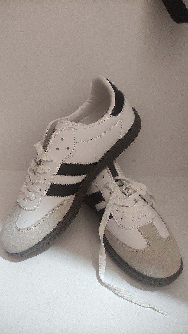 Beyaz ve gri renkli, kauçuk tabanlı erkek spor ayakkabısı, desen içermeyen şık sokak tarzıyla kolay şıklık sunar.