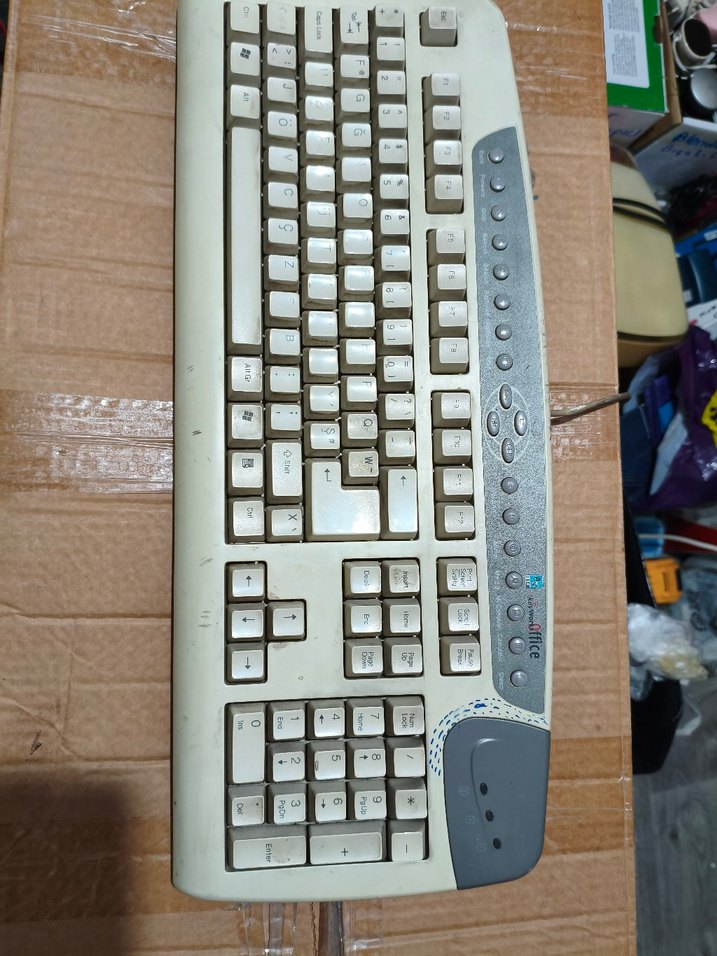 Tam tuş setine sahip beyaz ve gri kablolu klavye. Kullanımdan hafif yıpranmış görünüme sahip.⌨️