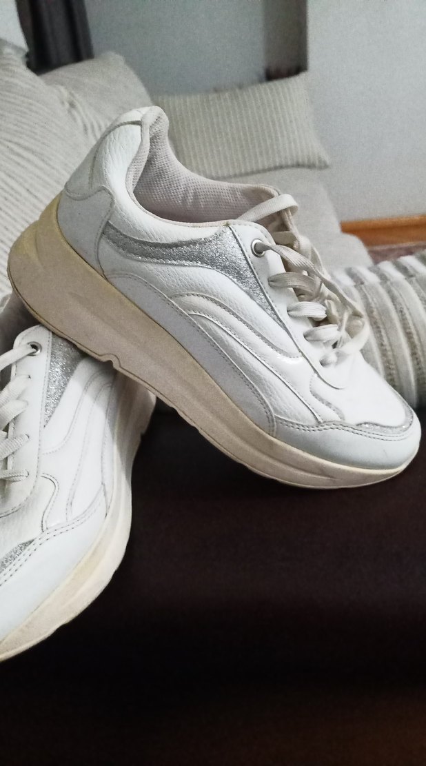 Beyaz ve gri renkte, dolgu topuklu ve kauçuk tabanlı kadın spor ayakkabısı, sportif ve rahat sokak stili için şık bir seçenek. çok temizdir.