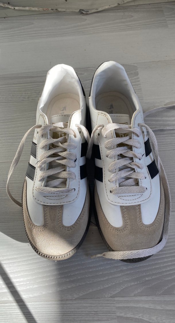 Beyaz ve gri renklerde, kauçuk tabanlı kadın spor ayakkabısı. Düz ve şık sokak stili, spor ve günlük kullanım için uygun.