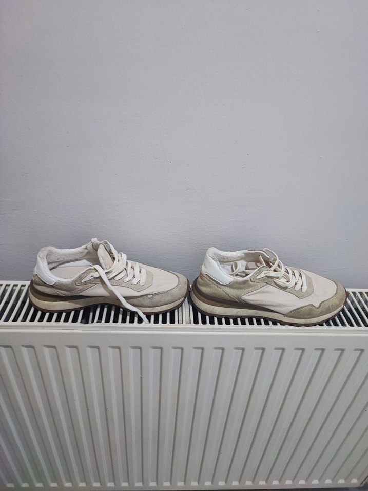 Beyaz ve gri renkte, lastik tabanlı, stilettolu topuklu, desen içermeyen kadın spor ayakkabısı. Spor ve gündelik kullanım için uygundur.