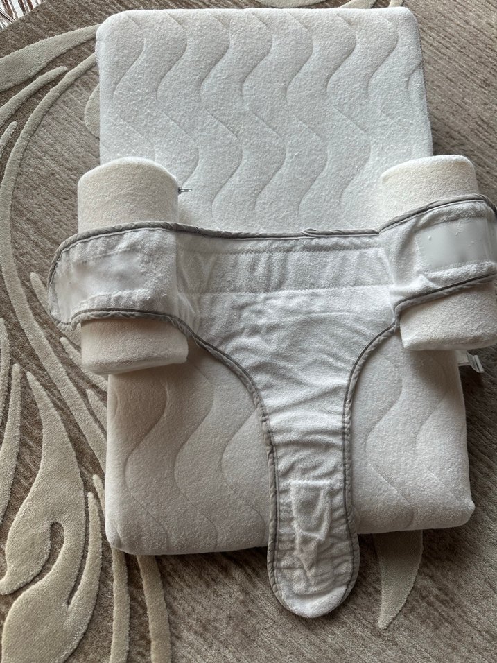 Beyaz ve gri kenarlıklı, yumuşak ve sıcak dokulu yenidoğan reflü yastığı (yatağı )