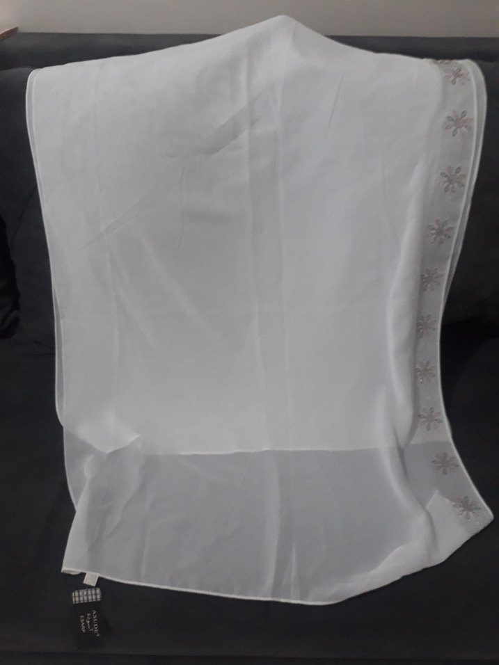 Kadınlar için beyaz ve gri renkli, ipek dokulu, drapeli sade ve minimal tarzda şal. Hafif çiçek desenli kenarıyla zarif görünüyor.
